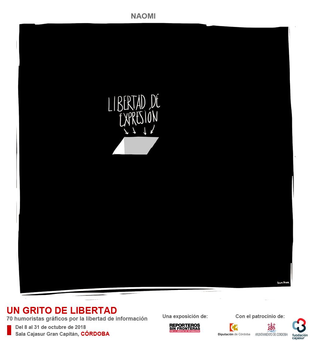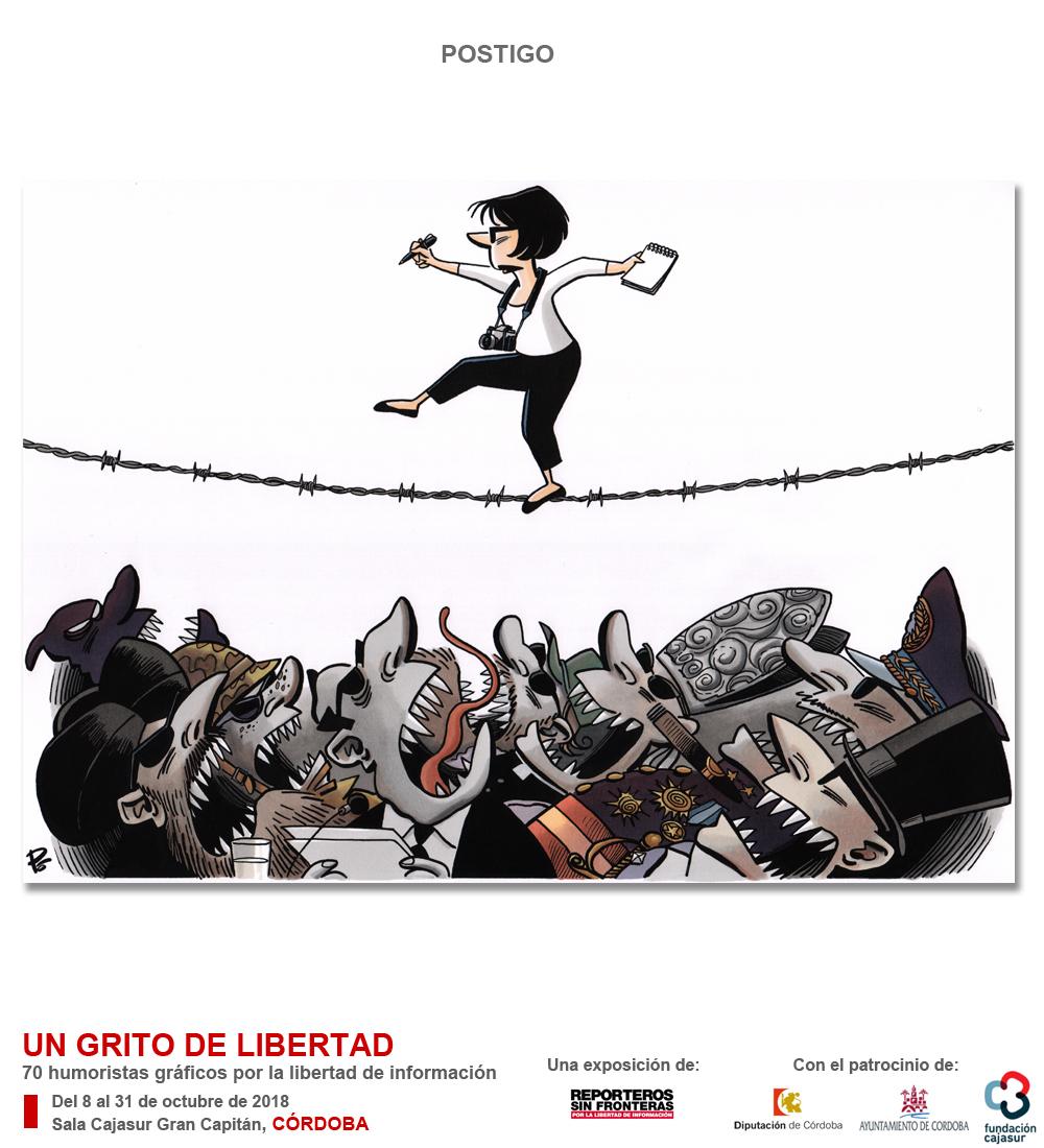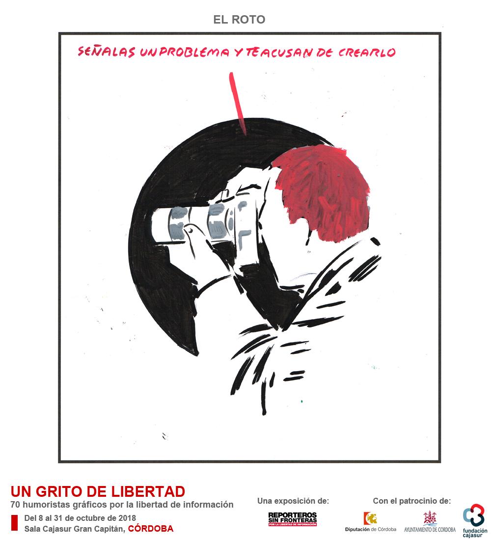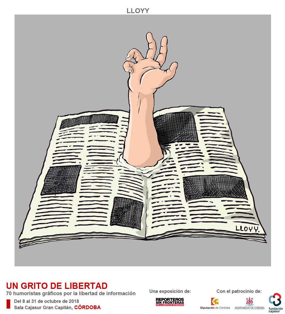 Córdoba acoge del 8 al 31 octubre, en la sala Cajasur Gran Capitán, la IV Edición la exposición de Reporteros Sin Fronteras (RSF) “Un grito de libertad”, compuesta por 70 dibujos originales de humoristas gráficos españoles que contribuyen con su ingenio a la lucha por la libertad de información de la organización. Con el patrocinio de la Diputación de Córdoba, el Ayuntamiento de Córdoba y la Fundación Cajasur, la muestra incluye en esta nueva edición viñetas de 17 dibujantes andaluces.