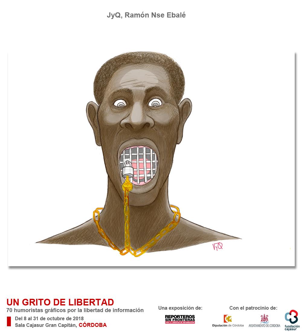 El bloguero e ilustrador Ramón Nse Ebalé, JyQ, es otra de las grandes novedades de la exposición de Reporteros Sin Fronteras. Hace un año estaba preso en su país, Guinea Ecuatorial, a causa de sus críticas al régimen de Obiang. Todos afilan sus lápices para reivindicar la libertad de prensa, el derecho a sacarle punta a la actualidad y a molestar a los poderosos.
