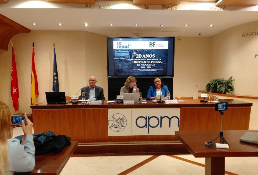 El documento ha sido presentado el lunes 13 de abril, en un acto cuya apertura corrió a cargo de la secretaria general de la Asociación de la Prensa de Madrid (APM), Mónica Tourón y fue coordinado por la vicepresidenta de RSF España, Edith Rodríguez Cachera. El periodista independiente Carlos Fernando Chamorro, fundador del emblemático medio de investigación Confidencial, fue el invitado destacado del evento, celebrado en la sede de la APM. Fundado en 1996, Confidencial fue clausurado por el régimen Ortega-Murillo y Chamorro se vio forzado al exilio, despojado de su nacionalidad. Huyó primero hacia Costa Rica y, posteriormente, a Madrid, donde reside hoy con nacionalidad española. La presentación del contenido del informe corrió a cargo de la periodista y coautora Maryórit Guevara, fundadora del colectivo “Las Exiliadas Nicas”, un grupo de reporteras nicaragüenses en el exilio español con perspectiva de género.